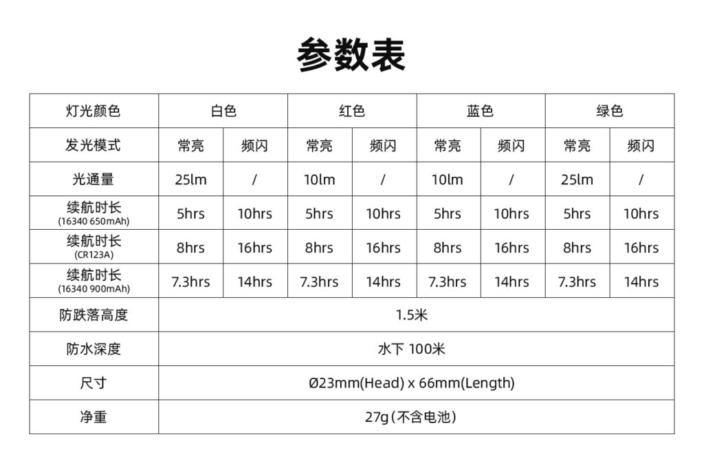 SD1 四色迷你潜水信号灯 • 水下100米防水,海陆两用 • 4种光源, 8种发光模式 • 轻转筒身,即可模式切换 • 兼容CR123A和带板16340 • 低电量提醒,不惧没电 • 记忆功能,仅需两步 • 长孔位设计,携带便捷