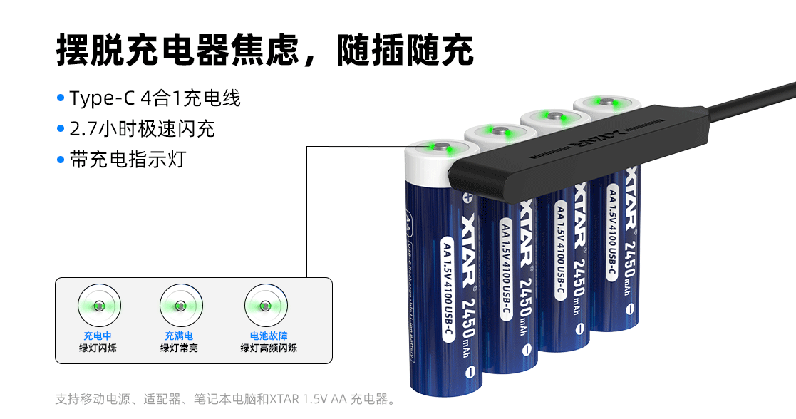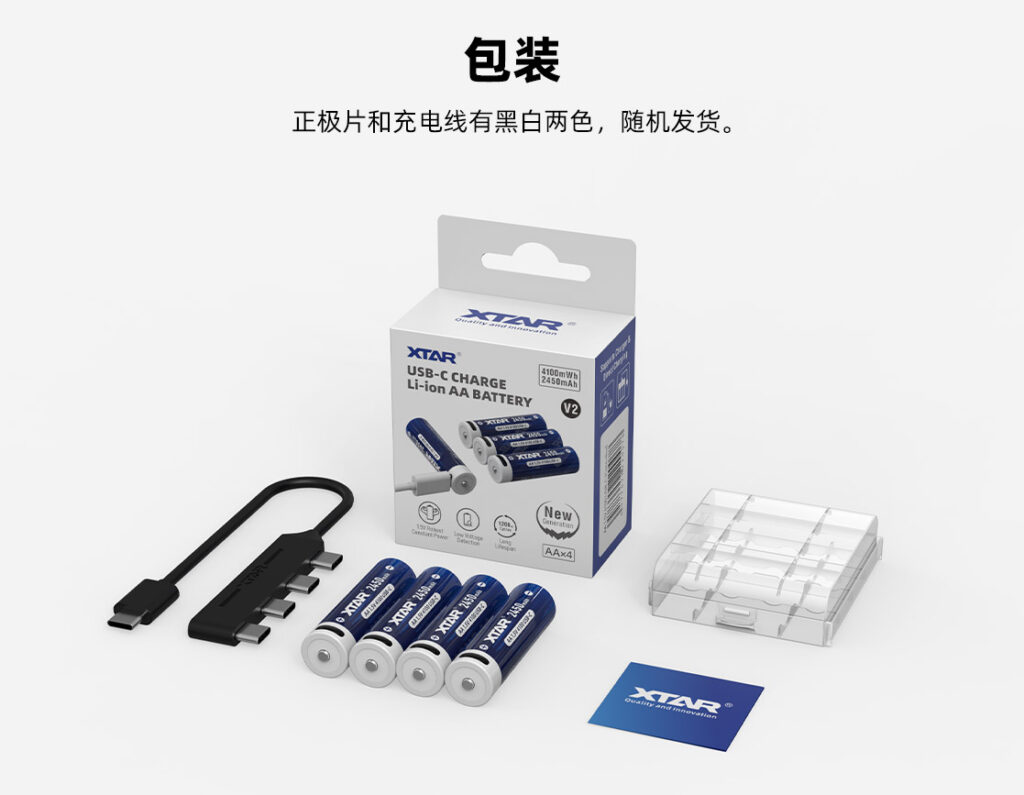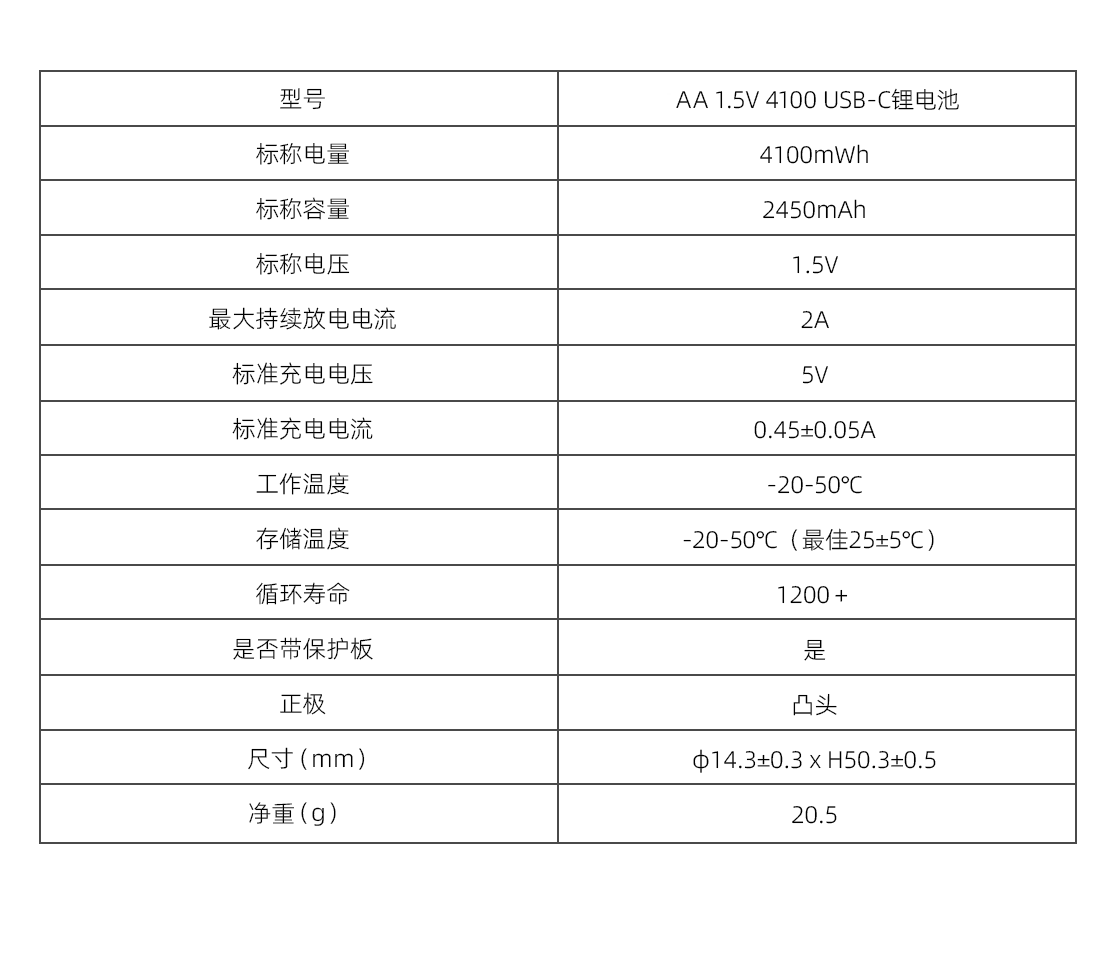AA 1.5V 4100mWh USB-C 锂电池 新一代!· 4100mWh/2450mAh高电量,延长续航时间。· 1.5V 2A稳定强劲输出。· 4合1 USB-C 便捷直充线。· 2.7小时快速充电,减少等待时间。· 1200 次循环,更耐用。· 多重保护确保使用安全。