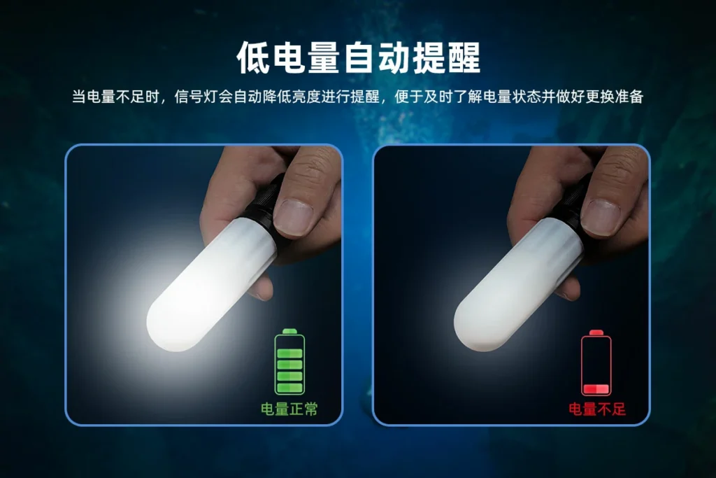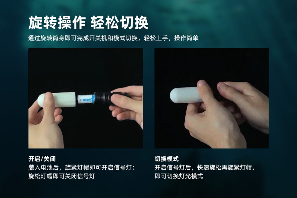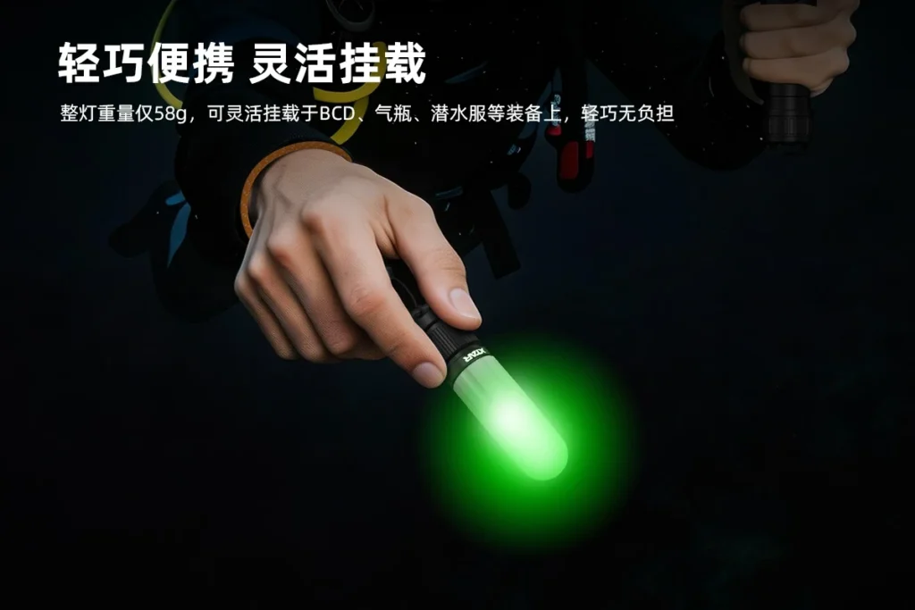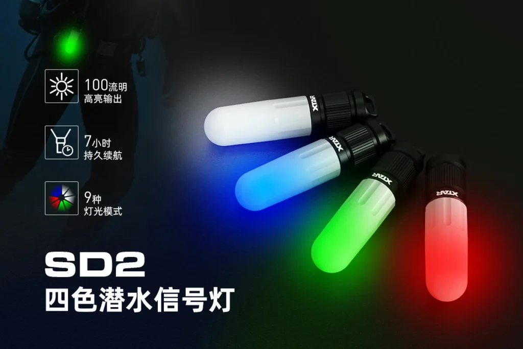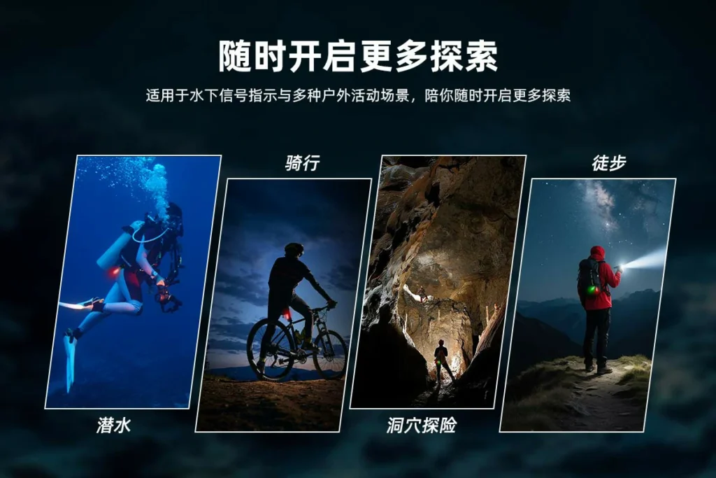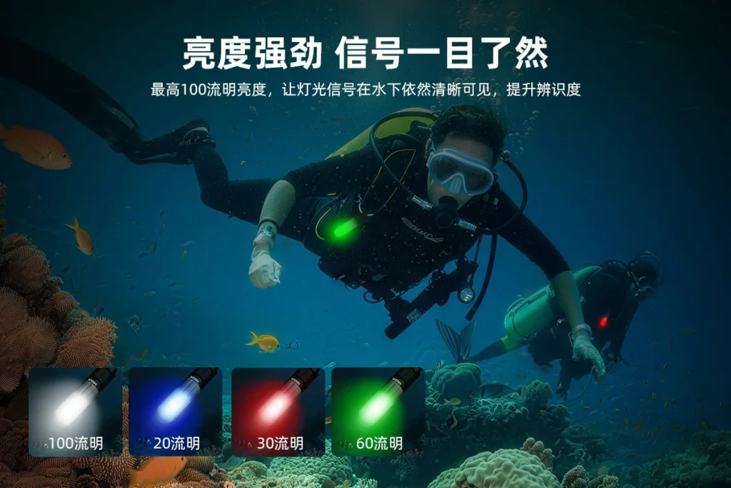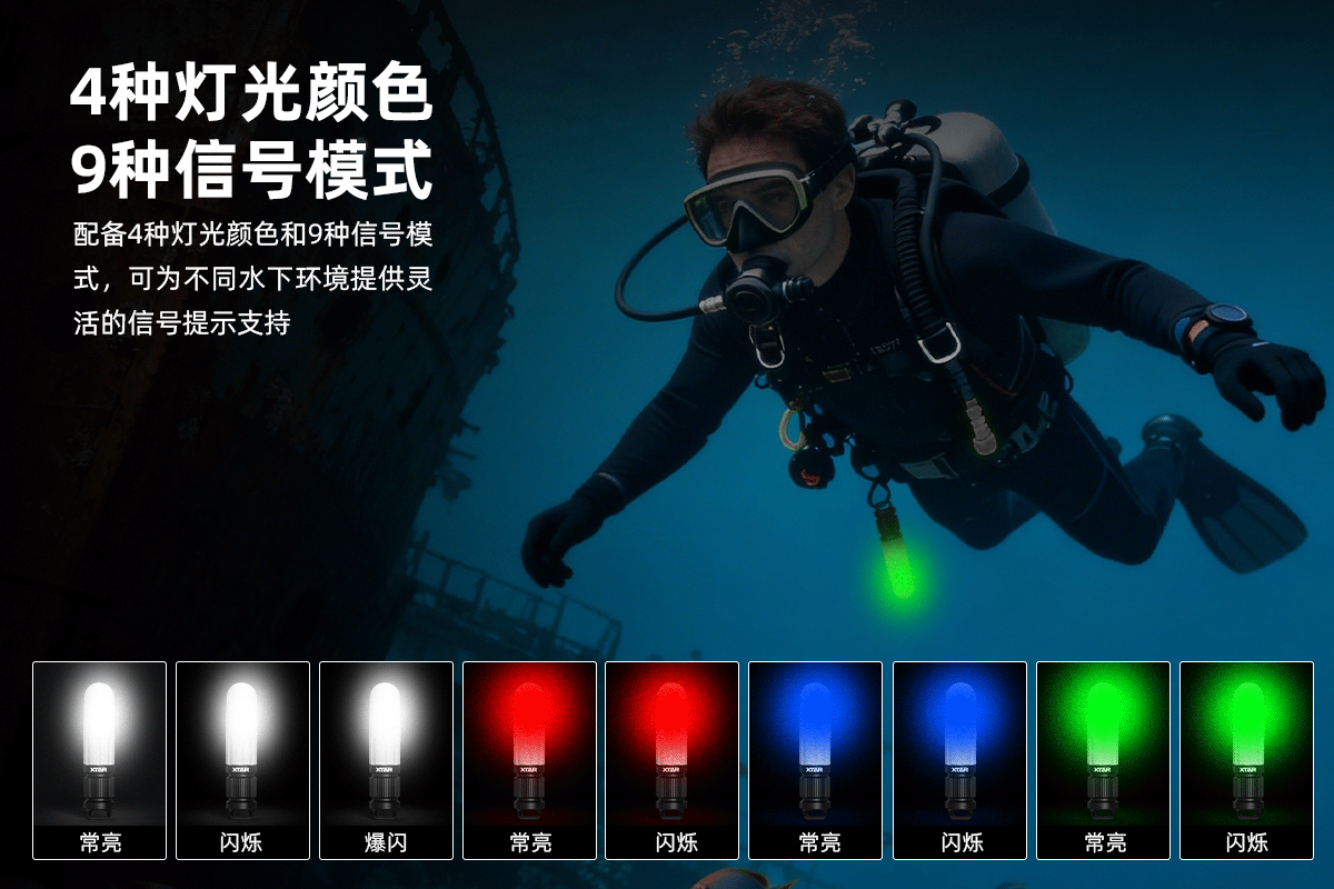 ·4种灯光颜色,9种灯光信号模式,适合不同水下沟通和警示场景